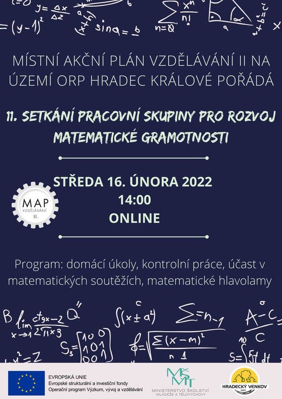 Ve středu dne 16. února 2022 od 14:00 se uskuteční 11. setkání Pracovní skupiny pro rozvoj matematické gramotnosti na téma: domácí úkoly, kontrolní práce, účast v matematických soutěžích a matematické hlavolamy.