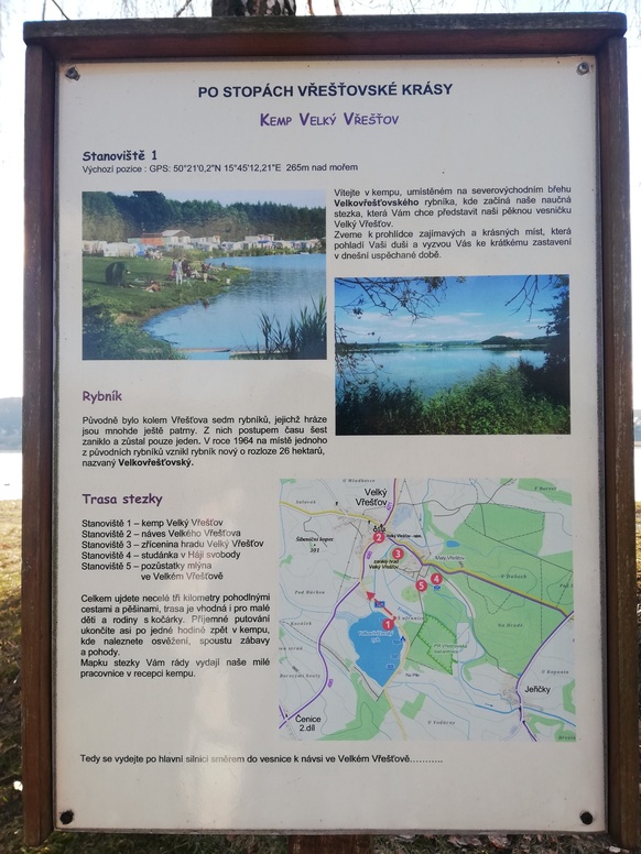 Start i konec stezky najdete právě v kempu u Velkovřešťovského rybníka, kde si můžete zakoupit mapku této stezky.